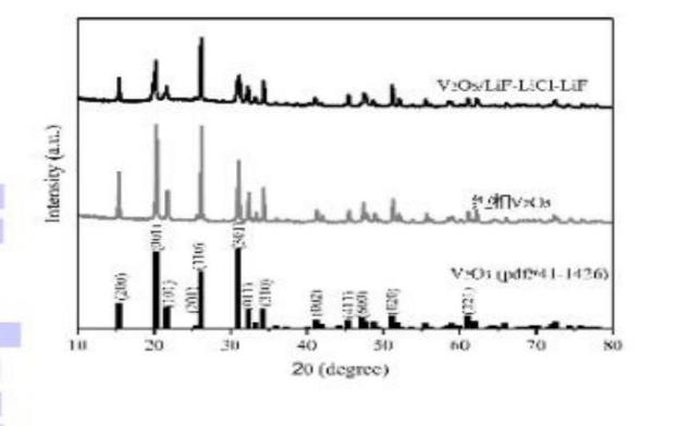 本发明公开了一种无粘接剂型 V2O5/熔融盐电解质电极 材料及其制备方法和应用。无粘接剂型 V2O5/熔融盐电解质 电极材料为微纳颗粒,该颗粒由海胆状 V2O5 微纳颗粒和熔 融盐组成,熔融盐在海胆状 V2O5 微纳颗粒内部,海胆状结 构紧紧束缚住高温下易流动的熔融盐。其制备方法包括以 下步骤:通过加热将熔融盐溶于乙醇中,而后加入海胆状 V2O5 微纳颗粒,搅拌至混合均匀,得到混合液;将得到的 混合液在加热条件下不断蒸发掉乙醇,使熔融盐依附在海 胆状 V2O5 微纳颗粒内部空隙中;将得到的粘稠状样品,再 在真空条件下干燥,得到无粘接剂型 V2O5/熔融盐电极材 料。该材料高温放电性能好,导电性好,结构稳定,用作 热电池正极,避免添加惰性绝缘粘接剂,提高热电池高电 压放电时间