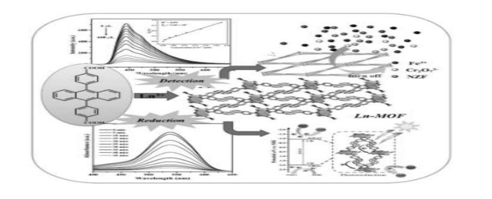 一种 Sm-MOF 的制备方法及其荧光识别和光催化的应用, 将钐盐和配体 4,4'-(蒽-9,10-二基)二苯甲酸与 N,N-二 甲基甲 酰胺和去离子水,在高压反应釜中水热反应,生成 Sm 基配合 物 [Sm(ADBA)(HCOO)(DMF)];将配合物采用玛瑙研钵研磨粉碎 后,分散离子水中,进行识别水体中的有机污染物,该有机晶 态 材 料 能 够 通 过 荧 光 猝 灭 的 方 式 快 速 识 别 水 体 中 的 Fe3+,Cr2O72-,和呋喃西林抗生素 (NZF)。优点是检测速度快, 效 率 高 , 且 能方便 回收 再利用 ,其 中有机 晶 态材 料检 测 Fe3+,Cr2O72-, 和 呋 喃 西 林 的 最 低 检 测 限 低 至 0.50ppm , 0.51ppm 和 0.62ppm。其次,该有机晶态材料也可作为光催化 还原水体中 Cr (VI)的催化剂,在可见光下将水体中 Cr (VI)还 原为 Cr (III),在 50 分钟内 Cr(VI)去除率为 99%、反应速率 达 0.066min-1
