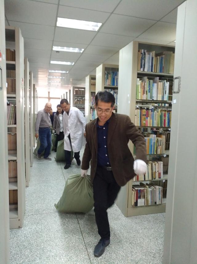 10月17日下午,图书馆两个党支部开展“不忘初心、牢记使命”主题教育义务劳动,把十一层书库的部分书籍转移至一层书库。