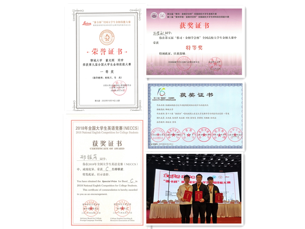 坚持“第二课堂服务第一课堂”的指导思想,加强对学生科技创新能力的培养,五年来,共计700余名学生参与了128个创新基金项目,其中国家级11项,省级5项,获得经费高达50余万元;目前取得成果150余项,其中申请专利4项,发表论文120余篇。学生在全国金相大赛、全国英语竞赛等国家级竞赛中获奖67项,今年实现了教指委全国金相大赛一等奖的突破;在山东省“挑战杯”大学生课外学术作品大赛、“挑战杯”大学生创业计划大赛、高分子实用技术大赛等省级赛事中获奖20项。