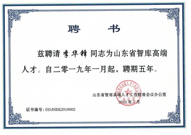 李华锋被聘为山东省智库高端人才