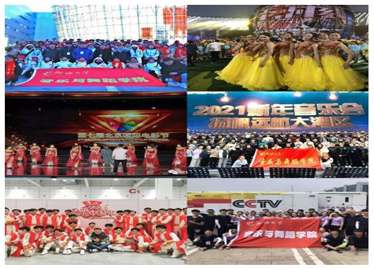 学院主动出击、积极协调,自2015年开始连续登上北京卫视跨年春晚舞台,并于2017年参加了中央电视台综艺频道“歌声飘过九十年”文艺演出和中央电视台电影频道“第七届北京国际电影节文艺演出”以及北京卫视“不忘初心,面向未来——中国电视剧导演年度榜样盛典”,2018年参加中央电视台体育频道《最佳时刻》节目录制,2020年参加了中央电视台《2020年元旦联欢晚会》节目录制。