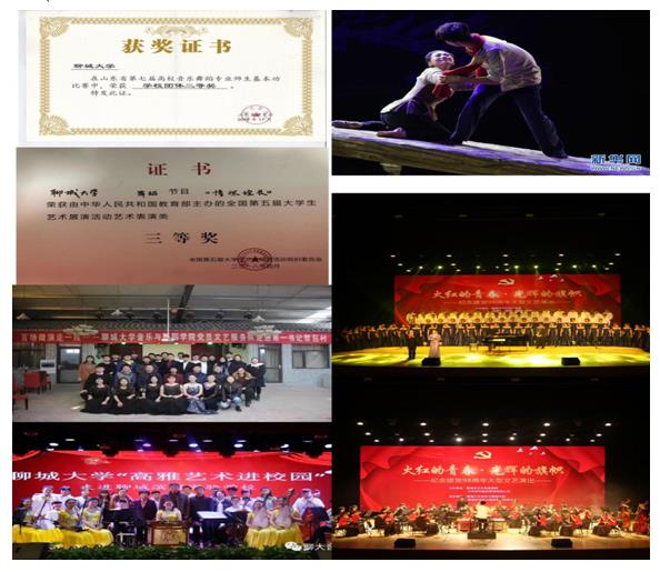 学院根据自身专业特点,通过“上讲台”“上赛台”“上舞台”,创新探索“上三台”人才培养模式。在“上赛台”工作中,学院学生参加2018年山东省大学生校园最美歌声大赛获一等奖、二等奖,参加2019年山东省大学生合唱艺术节获一等奖,合唱《松花江上》《捉弄》在2017年举办的山东省和全国第五届大学生艺术展演活动中分获省级一等奖和全国二等奖。五年来,通过“上三台”人才培养模式,学院累计派出学生800余人次参加实习支教,很好地改善了当地中小学音乐教育局面;累计500余人次在省部级以上赛事中获奖308项;累计2000余人次参加各级各类舞台演出480场,通过系列工作,人才培养质量显著提高,就业率和就业质量逐年提升。