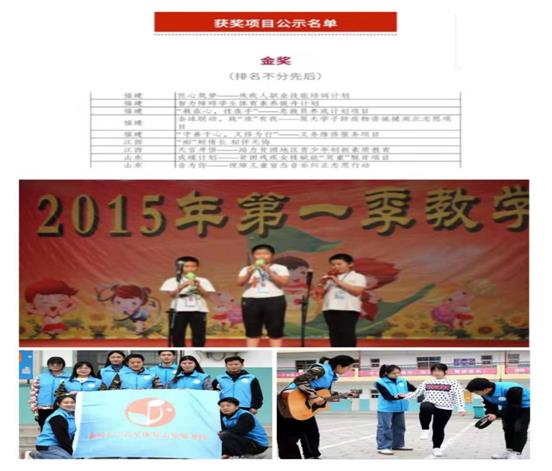 学院《音乐文化课堂进乡村》项目参加2015年第二届中国青年志愿者服务项目大赛获全国银奖,《“音为你”——视障儿童盲态音乐纠正志愿行动》项目参加2020年第五届中国青年志愿者服务项目大赛获全国金奖,奠定了学院志愿服务工作在全省全国高校的突出地位。