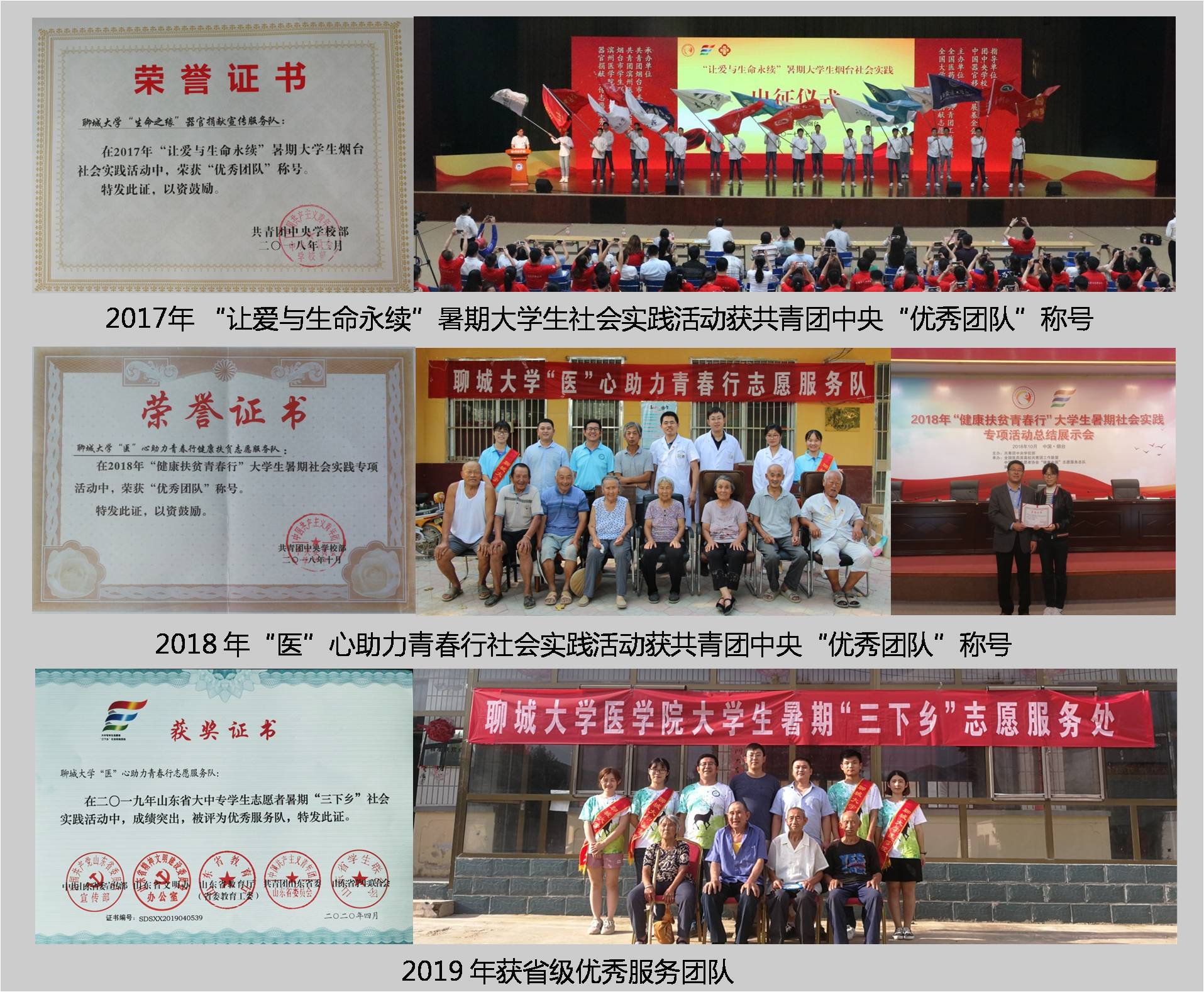 自2017年暑假开始,医学院连续三年积极组织学生参加团中央和全国医药类高校共青团工作联盟组织的“健康扶贫青春行”全国大学生暑期社会实践专项行动,连续三年获得了省级、国家级奖励。2017年,赴烟台组织开展“生命之缘”器官捐献宣传活动,荣获团中央“优秀团队”和省级优秀服务队;2018年,赴国家级贫困县山西灵丘开展的“健康扶贫青春行”活动,获团中央“优秀团队”,多人获省级优秀学生和优秀指导教师;2019年,赴冠县开展的“健康扶贫青春行”活动,获省级优秀服务队,多人获省级优秀学生和优秀指导教师。