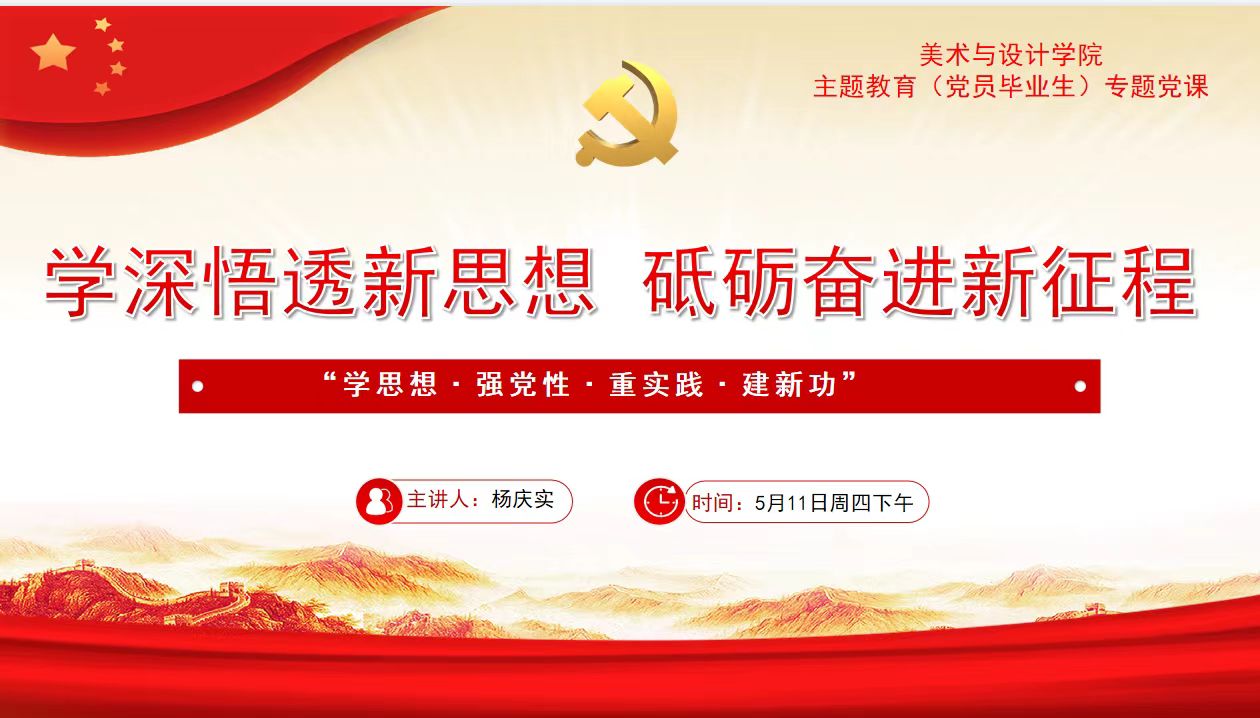 5月11日下午,美术与设计学院党委书记杨庆实在西校区七号楼一楼多功能厅,以“学深悟透新思想 砥砺奋进新征程”为题,为毕业生党员上主题教育专题党课。学院毕业生党员二十余人到场认真学习。
