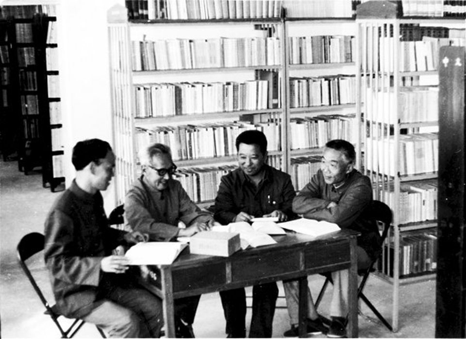 中文系教师在研讨学术问题,左起:李戎、史恩涛、韩立群、孙慎之