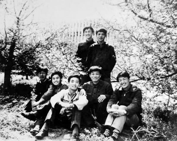 校内苹果园合影 左起前排:黄祖杰、唐济川、孙学科、郝明朝、高丹 后排:王中、杨兆喜 图片由作者提供