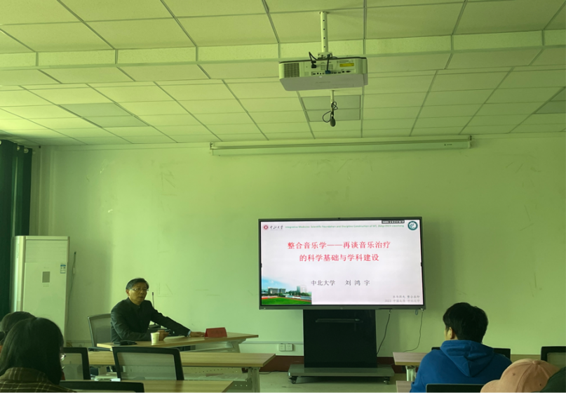 讲座中,首先刘教授从六个方面对音乐的再认识进行讲解:1.音乐是一种“运动”;2.音乐是一种“非药物治疗手段”;3.“整合音乐学”主要观点;4.音乐治疗学专业建设;5.音乐治疗学学科建设;6.音乐治疗学学术交流与学术组织建设。接着,刘教授指出了音乐学中的科学问题,以物理学的角度,系统科学的讲解了乐音声学、音乐心理声学、医学音乐治疗设备研制等一系列学术问题。随后,他又介绍了从古希腊时期就有人提出用音乐疗愈伤痛,我国古代《黄帝内经》中记录了“五音疗疾”,表明了音乐治疗的科学性以及可行和发展性。最后,他例举出了十个与音乐治疗相关的研究领域,比如民族艺术传统,音乐作品研究,音乐表现形式等等。下午交流中, 刘教授首先听取了学院副院长王海华、第四人民医院行为治疗科主任田海明医生、市中心医院赵光伦医生、学院音乐治疗教师苗苗的工作项目成果,分别为他们的项目设计和工作方向给出了许多的建议,为以后项目的研究指明了方向。随后从运动舞蹈学的角度,详细的讲解了舞蹈的运动康复功能以及日后的发展方向。刘鸿宇教授的讲座,展现了他积极思考、敢于质疑的学术精神,具有很强的理论性和前沿性,他对音乐与医学的思考为我院研究生提供了一个开阔学术视野、了解学术前沿知识的平台。