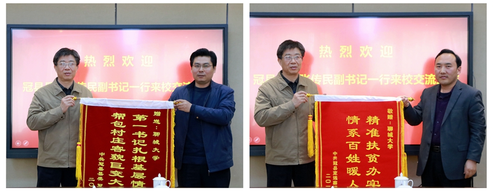 王强对冠县县委县政府、定远寨镇党委政府为驻村干部工作生活提供的关心关怀和支持帮助表示感谢。他指出,近年来,学校与冠县交流密切,先后选派了20多名干部挂职锻炼、帮包服务,建立了良好的交流合作关系,结下了深厚的友谊。今后,学校将继续发挥智力优势,在教育、科技、文化、乡村振兴等方面,提供有力支持,为冠县经济社会发展贡献聊大力量。同时,他希望3名即将结束帮包工作任务的第一书记,继续发扬艰苦奋斗、攻坚克难的好作风,扎扎实实投入到本职工作中去,为学校事业改革发展作出更大贡献。