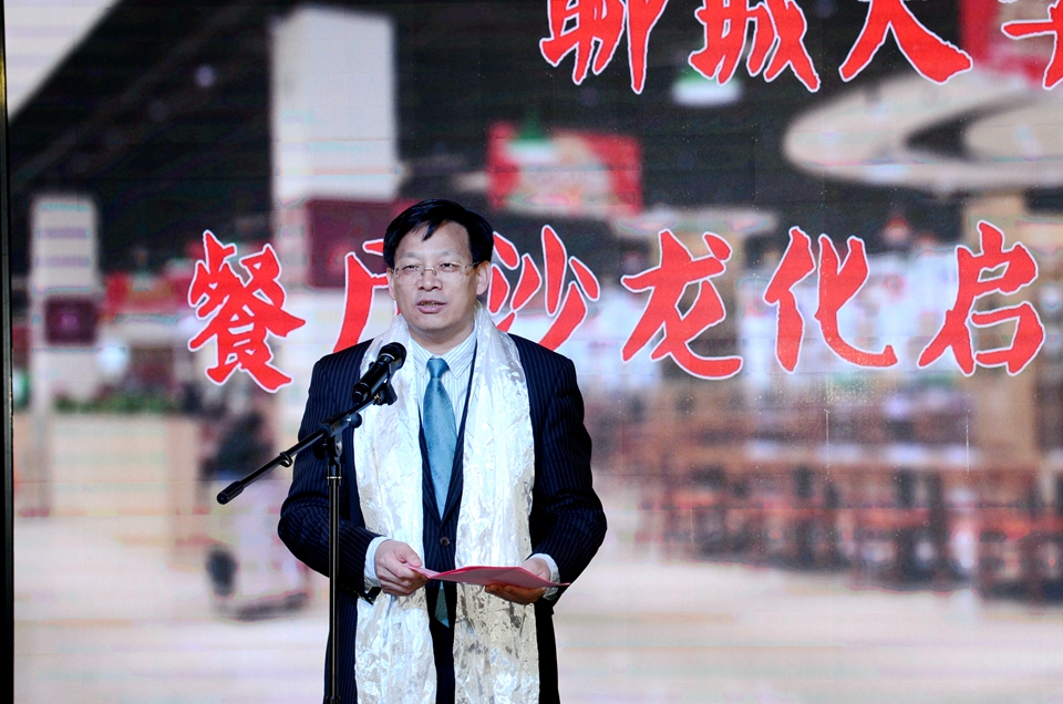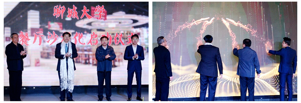 乔丙武宣读了《今年会官方网站餐厅沙龙化实施方案》。蔡先金、赵长林、乔丙武和学生代表颜鹏走上台共同启动今年会餐厅沙龙。参会人员一同观看了餐厅文化宣传片《爱在聊大 润物无声》。
