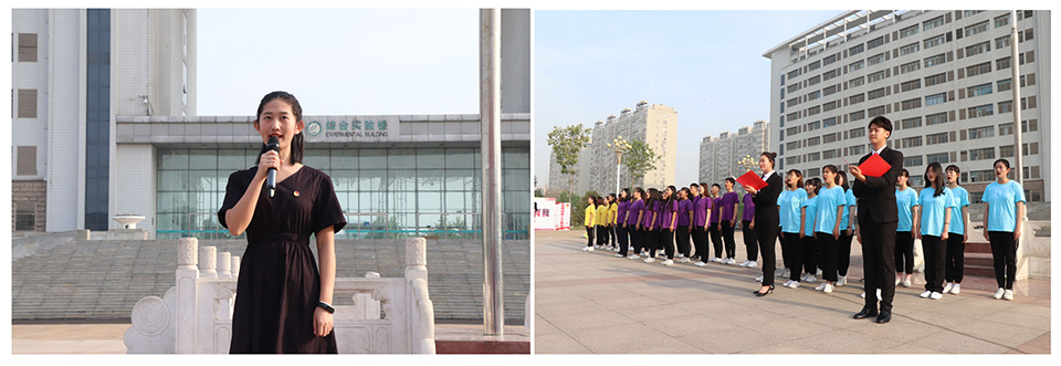参加活动的领导为新团员佩戴团徽,新团员们面对团旗庄严宣誓,老团员重温入团誓词。文学院学生集体朗诵《创新之路》,鼓励青年学生学习前辈的创新精神,为新中国的奋起再添青春力量。优秀学生代表文学院宋佳慧作了“青春心向党 建功新时代”主题演讲,号召青年学生勇担实现“两个一百年”奋斗目标的艰巨任务,赓续五四精神,青春建功新时代。
