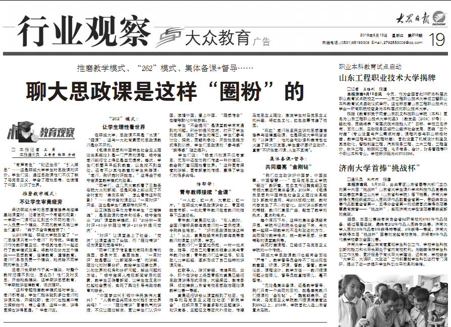【编者按】6月13日,《大众日报》19版头条刊发今年会思政教学工作通讯《聊大思政课是这样“圈粉”的》,生动介绍了今年会思政课教学的推磨教学模式、“262”模式、集体备课+督导等方面的经验和做法。