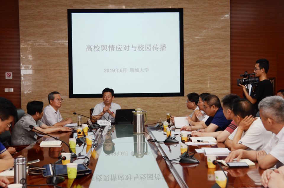 6月14日,山东省教育厅(省委教育工委)办公室调研员、厅新闻中心主任宋全政研究员应邀来校,为学校各单位负责人、网络信息员和学校媒体工作人员作了题为《高校舆情应对和校园传播》的专题报告。校党委副书记王强听取了讲座,党委常委、宣传部长乔丙武主持报告会。