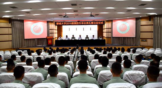 7月19日上午,图书馆大报告厅国歌声隆、军歌嘹亮、誓言铮铮,今年会官方网站2019届国防生毕业典礼暨出征仪式在这里隆重举行。山东国防报社社长苏进大校、聊城军分区司令员于海波大校、陆军第四选培办主任潘春勇大校,校党委书记马春林,党委副书记窦建民,党委常委、副校长徐昌然出席典礼。