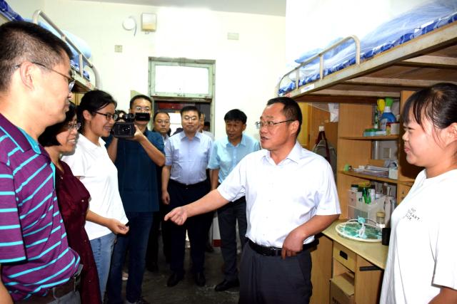 9月15日新生报到,党委书记马春林,党委常委、副校长赵长林、赵明吉,党委常委、宣传部长乔丙武一行来到迎新现场检查指导工作,并亲切慰问参加迎新的师生员工,看望2019级新同学和家长。