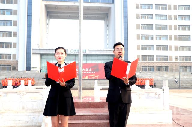 在鲜艳的共青团旗下,在优秀团员代表的带领下,全体团员青年重温入团誓词,深深铭记属于共青团员的使命责任。“我宣誓,我志愿加入中国共产主义青年团,……”每一张青春坚毅的面庞,每一声响亮有力的誓言,代表着聊大团员青年奋斗奉献的决心。宣誓毕,全体团员青年齐唱团歌《光荣啊,中国共青团》。