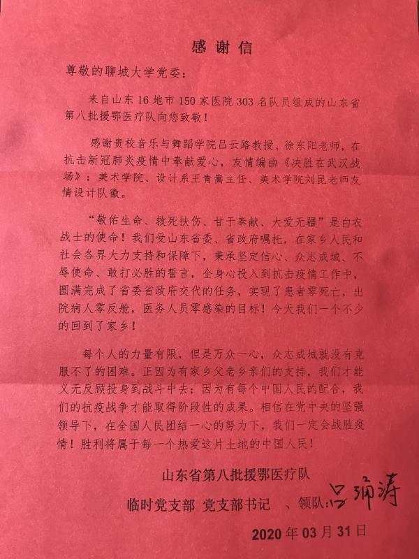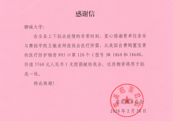 “感谢贵校音乐与舞蹈学院吕云路教授、徐东阳老师,在抗击新冠肺炎疫情中奉献爱心,友情编曲《决胜在武汉战场》;美术学院、设计系王青嵩主任、美术学院刘昆老师友情设计队徽。”“衷心感谢贵单位音乐与舞蹈学院王敏老师虑我会医疗所需,从美国自费购置宝贵的医疗防护物资N95口罩120个(型号3M1860和1860S,价值5760元人民币)无偿捐献给我会。"近日,山东省第八批援鄂医疗队、莘县慈善总会给学校发来感谢信,感谢吕云路、徐东阳、王青嵩、刘昆、王敏5位老师在国家疫情防控中的无私奉献。
