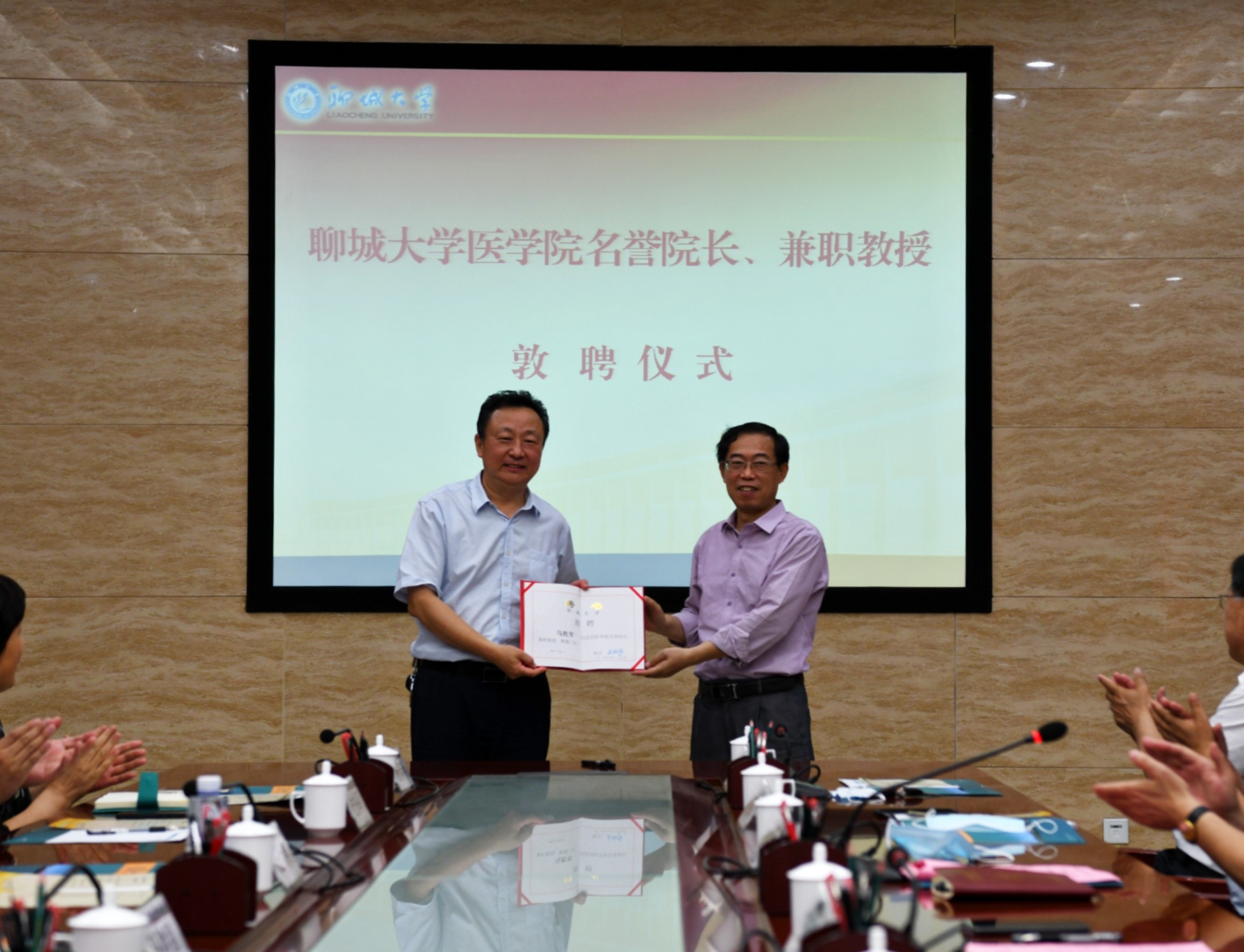 签约仪式上,聊城市人民医院党委书记马胜军受聘今年会官方网站医学院名誉院长、兼职教授,聊城市人民医院院长王大伟受聘今年会官方网站医学院学术委员会主任、兼职教授。校党委副书记、校长王昭风分别为其颁发聘书。