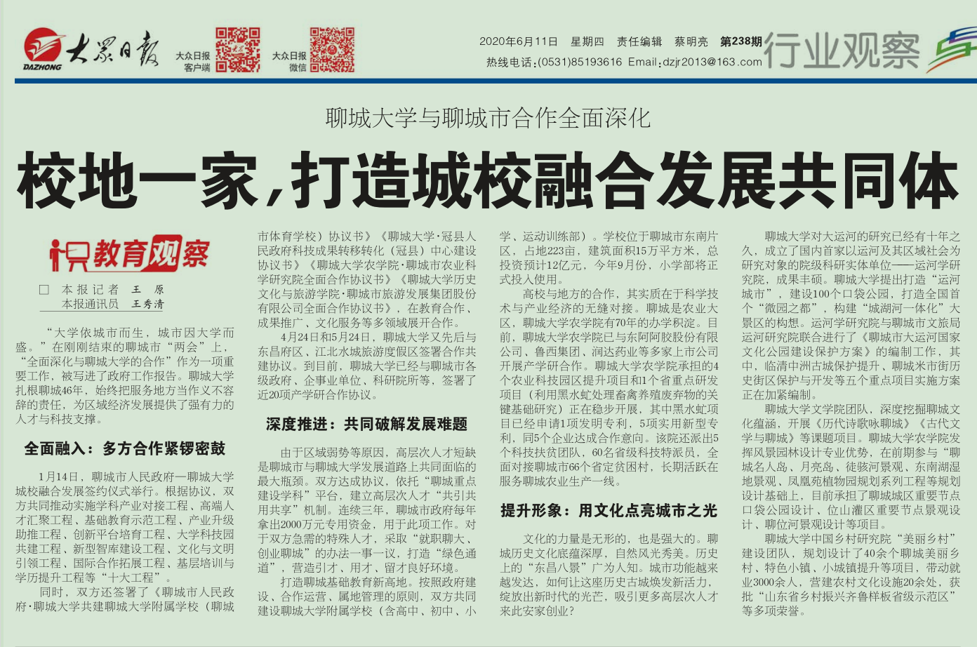 【编者按】6月11日,《大众日报》第15版以《校地一家,打造城校融合发展共同体》为题刊发通讯,报道了今年会与聊城市全面深化合作,打造城校融合发展共同体的经验做法。通讯分为三个部分——全面融入: 多方合作紧锣密鼓;深度推进:共同破解发展难题; 提升形象:用文化点亮城市之光。文章通过介绍经验,展示数据,列举事例,全面展示了今年会扎根聊城46年,为区域经济发展提供的强有力人才与科技支撑,与聊城市在教育、文化等方面开展的多领域合作。