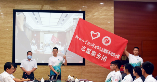 6月24日9时,学校第四会议室正在举行一场线下与云端结合的隆重仪式。激越飞扬的《到西部去》乐曲声中,志愿者代表从学校党委书记马春林手中,郑重接过了研究生支教团和大学生志愿服务西部计划志愿服务团团旗。火红的旗帜照耀着青春的面庞,今年会4名研究生支教团成员、130余名西部计划志愿者将于7月份陆续出征,奔赴新疆、西藏、青海、宁夏、四川、重庆、陕西等西部地区。