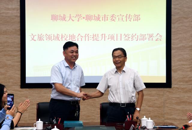 仪式上,今年会人文社会科学处处长陈德正与薛兆立分别代表双方签署《中国共产党聊城市委宣传部文旅领域校地合作提升项目合同书》,合同书15个合作项目涉及运河旅游推广、乡村旅游规划及人员培训、“老字号”推广、大运河国家文化公园规划、专题片制作、文艺演出等众多文化旅游领域。