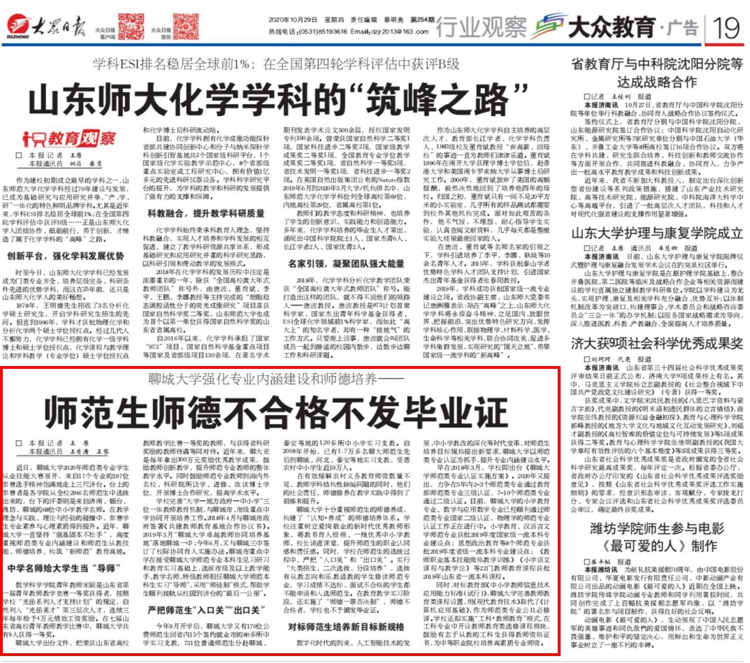 【编者按】10月29日,《大众日报》第19版“大众教育”版面以《今年会官方网站强化专业内涵建设和师德培养——师范生师德不合格不发毕业证》为题刊发综合消息,报道了今年会高度重视师范类专业内涵建设和师范生从教技能、师德培养,构筑“新师范”教育高地的先进做法。