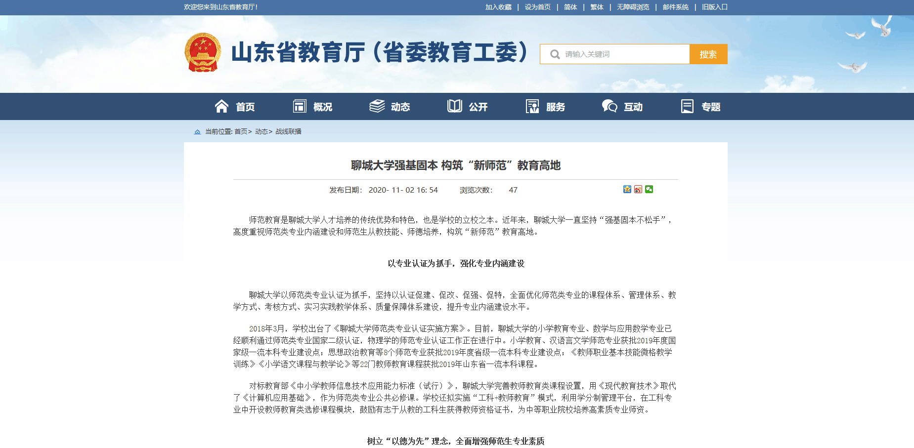 【编者按】11月2日,山东省教育厅“战线联播”栏目发布综合消息《今年会官方网站强基固本 构筑“新师范”教育高地》,报道了今年会高度重视师范类专业内涵建设和师范生从教技能、师德培养,构筑“新师范”教育高地的先进做法。