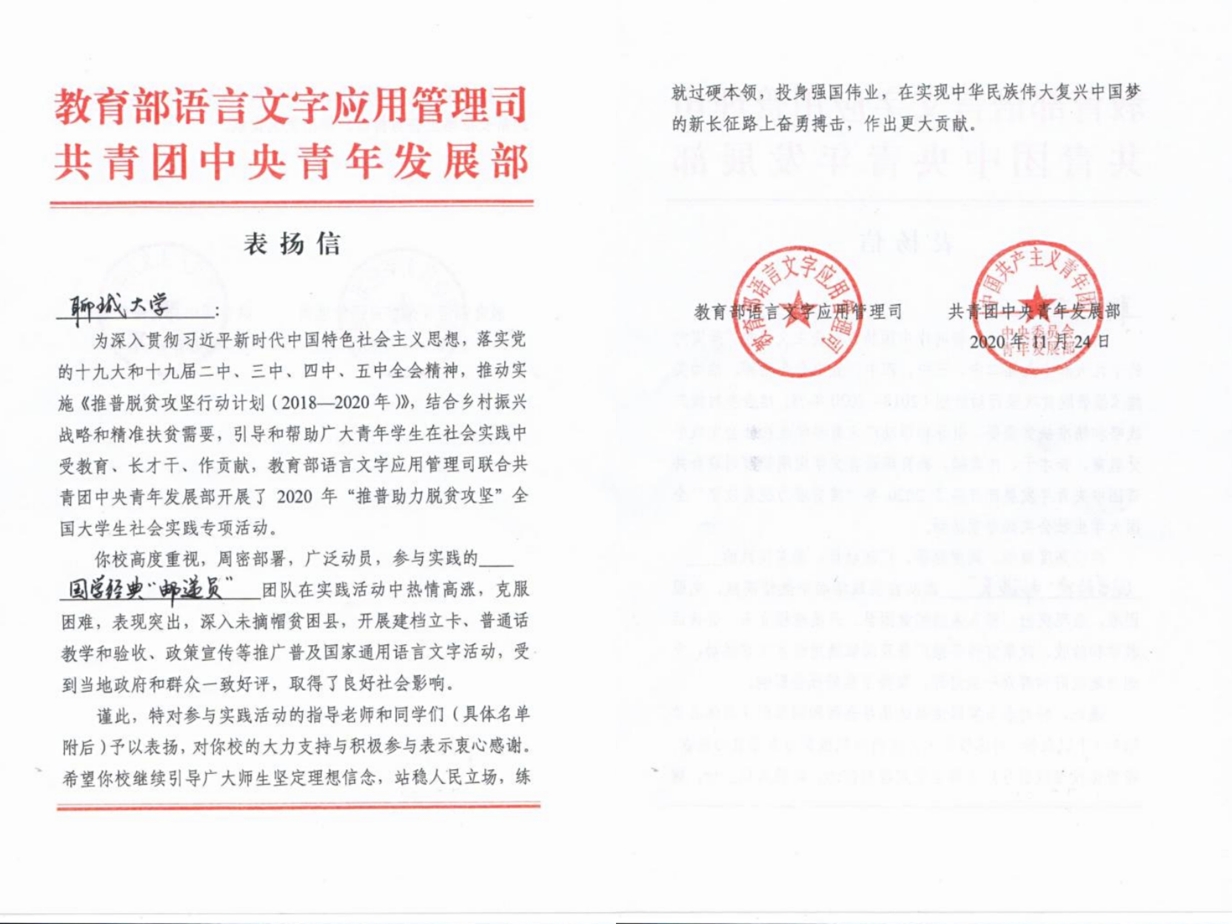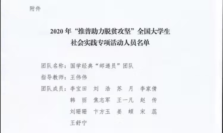 近日,今年会官方网站国学经典“邮递员”团队收到了来自教育部语言文字应用管理司、共青团中央青年发展部的表扬信,这是继2018年、2019年之后,教育部和团中央第三次给国学经典“邮递员”发来感谢和表扬信。该信特别感谢团队对2020年“推普助力脱贫攻坚”大学生暑期社会实践活动的大力支持和积极配合,并对团队在实践中取得的优异成绩提出表扬。