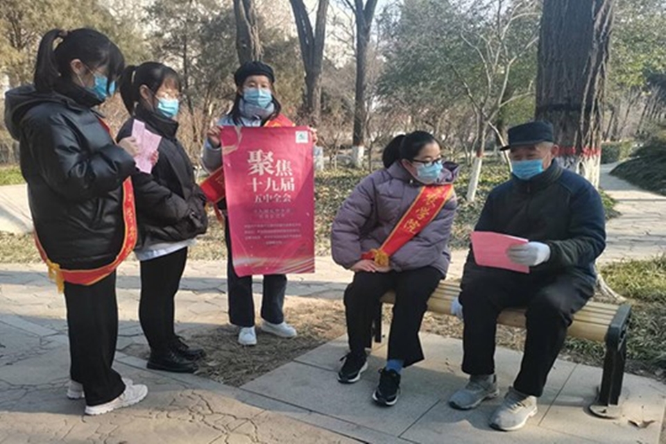 时代讲师——党的十九届五中全会宣讲 高擎十九大旗帜,做新时代的说书人。通过宣讲报告、调查研究、政策宣传等形式,鼓励广大青年学生全面深入学习宣传贯彻党的十九大精神。1月16日,农学院益路温暖服务队于聊城市人民公园举办了以“紧跟精神热潮,凝聚社会力量”为主题的宣讲活动。服务队成员向市民发放宣传页,介绍十九届五中全会内容并与市民交流探讨全会。