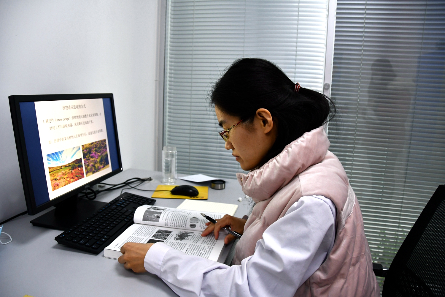 豆明珠老师下个学期给学生开《植物生理学》课,她正在紧锣密鼓地完成备课工作,今天要完成的备课章节是“植物适应逆境的方式”。她表示,为了适应混合式教学模式,她假期里要准备录制慕课,还要在线帮助在家的学生完成一些研究任务。豆老师很珍惜假期实验工作时间,她的实验记录本上记录得数据条分缕析,详细又认真。