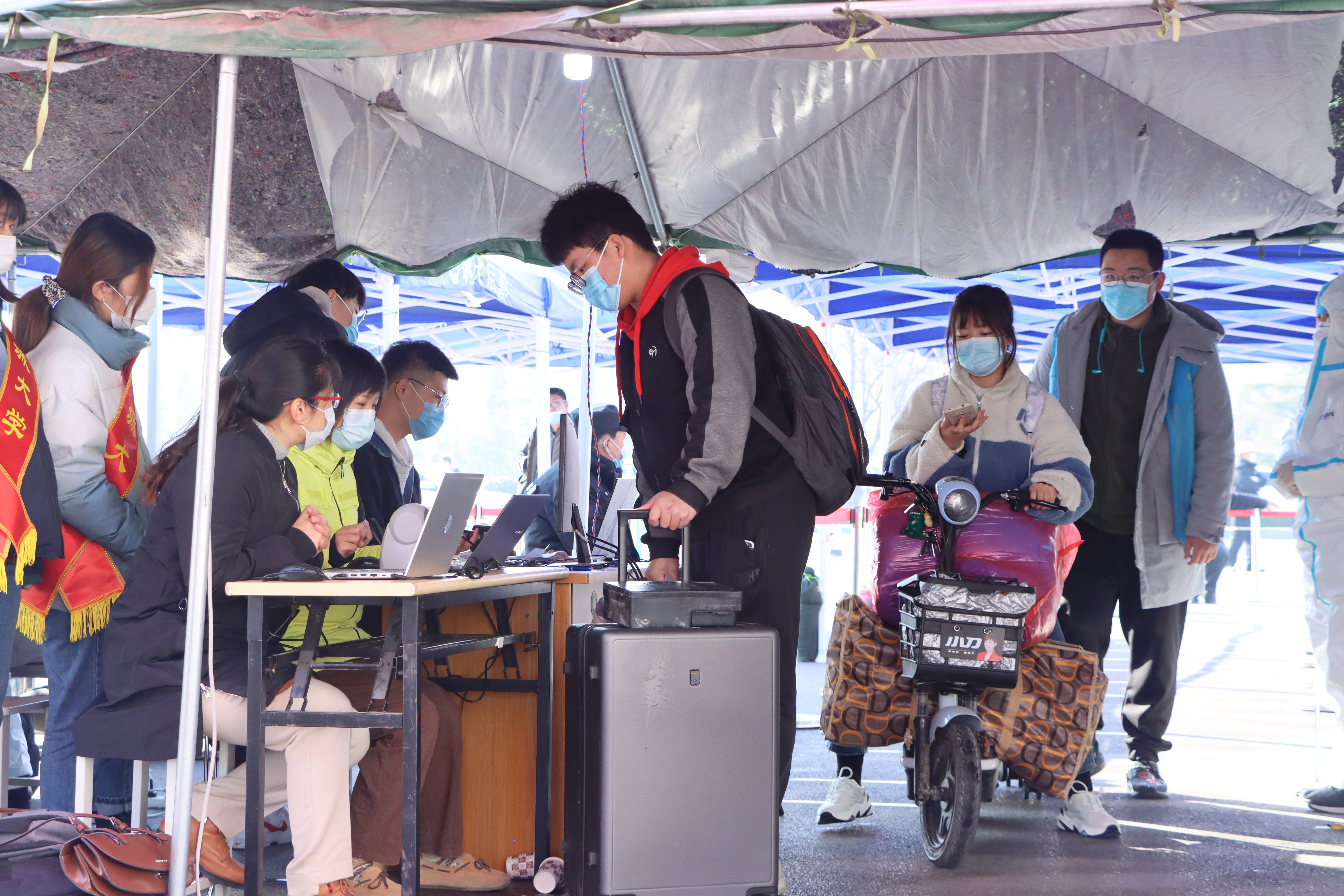 在返校报到点,王昭风一行看望慰问了一线工作人员,细致询问当下各学院返校学生具体人数,认真检查返校学生体温检测和健康码、身份验证工作,详细了解返校通道入口周边道路交通、车辆疏导等情况。