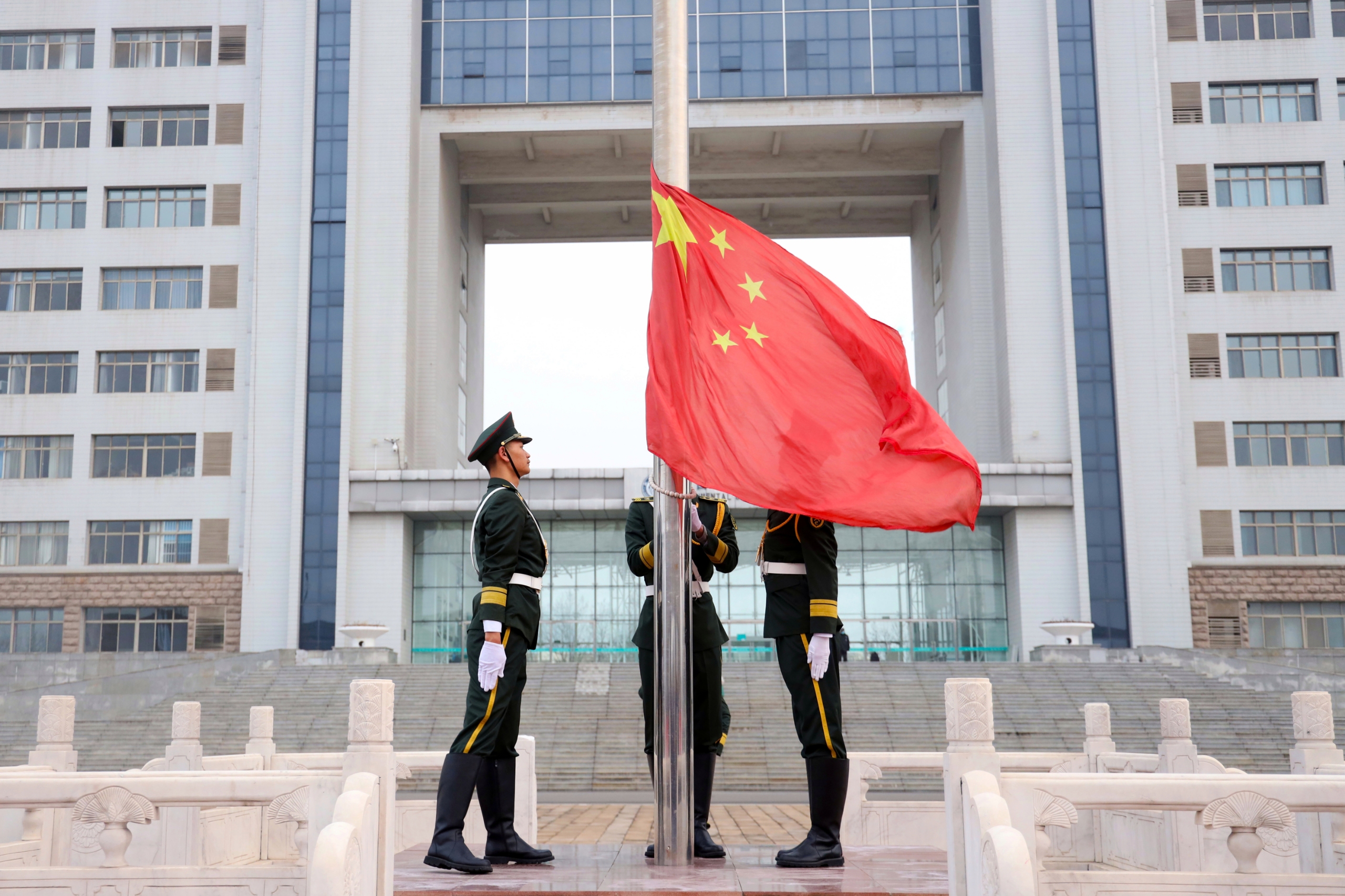 7时整,国旗护卫队目光坚毅、步履铿锵,护送国旗入场。伴随着激昂雄壮的《义勇军进行曲》,鲜艳的五星红旗在全体师生的庄严注目中冉冉升起。