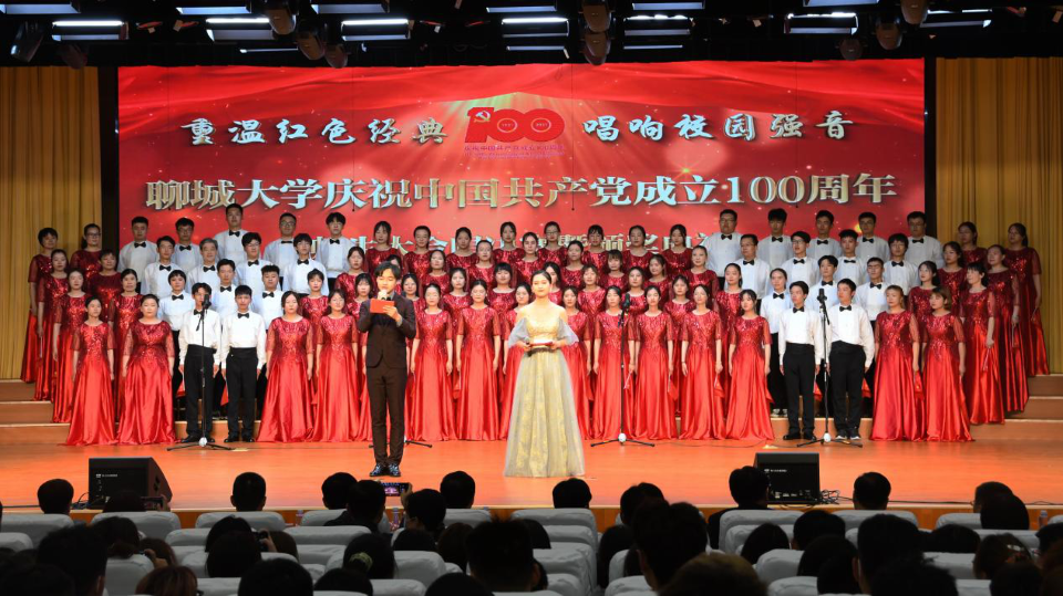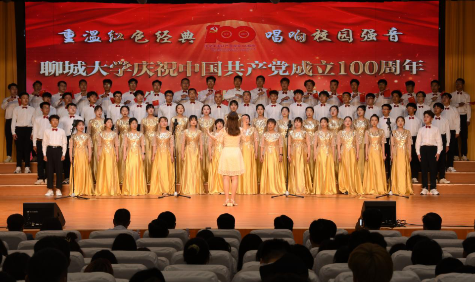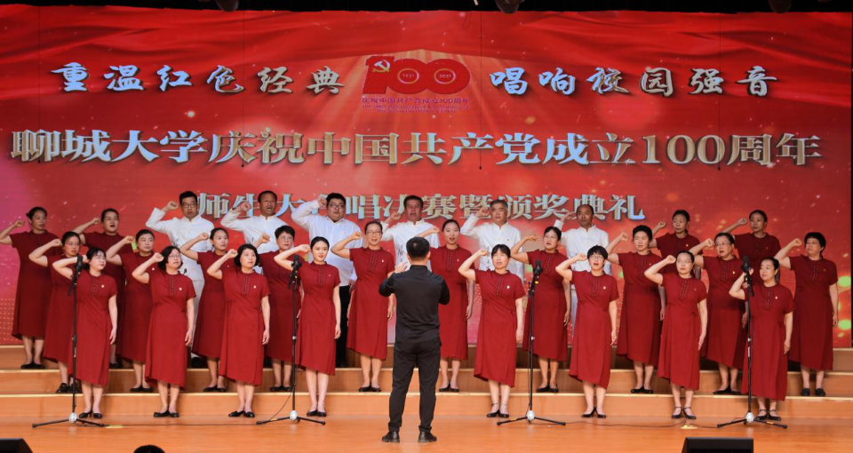 征途漫漫忆峥嵘岁月,歌声嘹亮颂百年初心。学团干部青年合唱团、教职工同心合唱团相继登台展演,深情演唱《我宣誓》《党旗飘扬的方向》《没有中国共产党就没有新中国》,以心歌唱、以乐传情,将“崇教、尚学、敦厚、奋进”的聊大精神展现得淋漓尽致。最后,大赛在崇乐合唱团《追寻》《飞向美好的明天》《没有中国共产党就没有新中国》的优美歌声中圆满落下帷幕,聊大师生以嘹亮的歌声、昂扬的姿态、奋进的力量,向中国共产党成立100周年献礼!