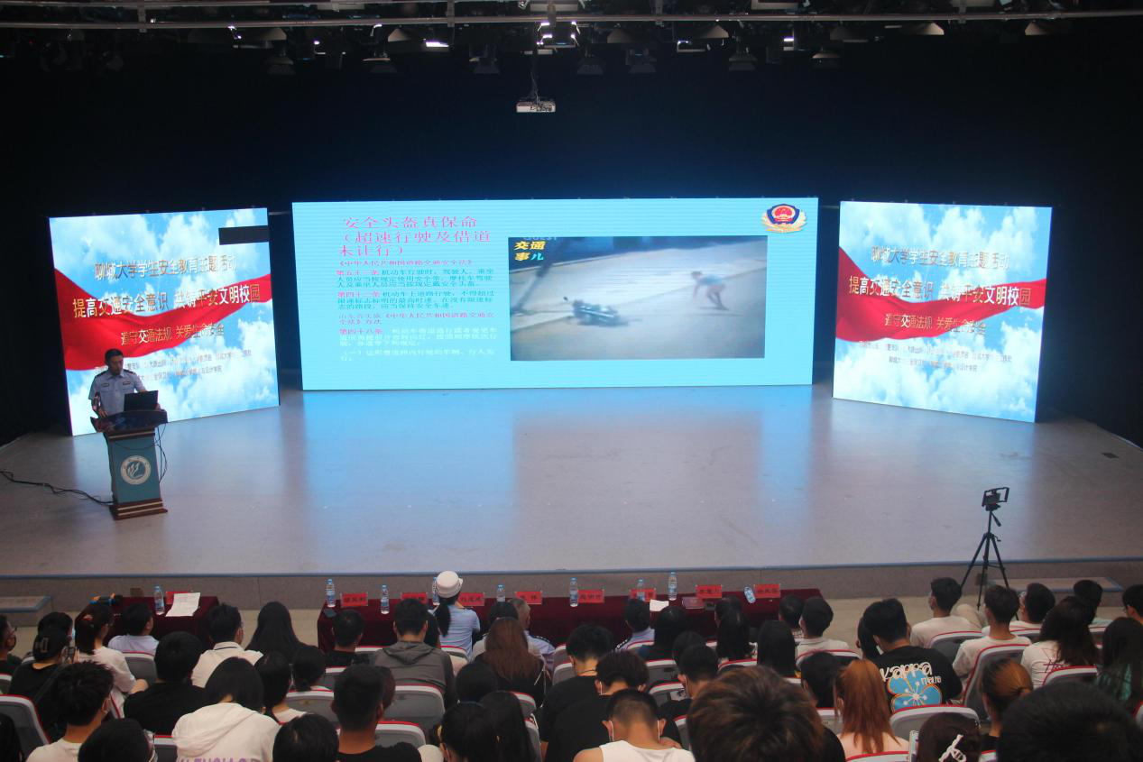 聊大派出所副所长邢艳蕾就学生交通安全情况进行通报。聊城市公安局交警支队执勤一大队事故科民警胡凤利作交通安全专题报告,他结合相关案例,从交通事故的概念、道路交通事故的判断标准、道路交通事故现场处置以及事故防范与自我保护四个方面作专题报告,通过ppt、视频展示和细致入微的讲解,对交通安全法规、交通安全知识进行宣传教育,教育引导同学们增强交通安全文明意识,自觉遵守道路交通规则,主动做到安全文明出行。学生代表、美术与设计学院袁馨然同学宣读校园交通安全倡议书,呼吁大家从每一个细节做起,养成良好的出行习惯,增强交通安全意识,争做文明交通参与者。