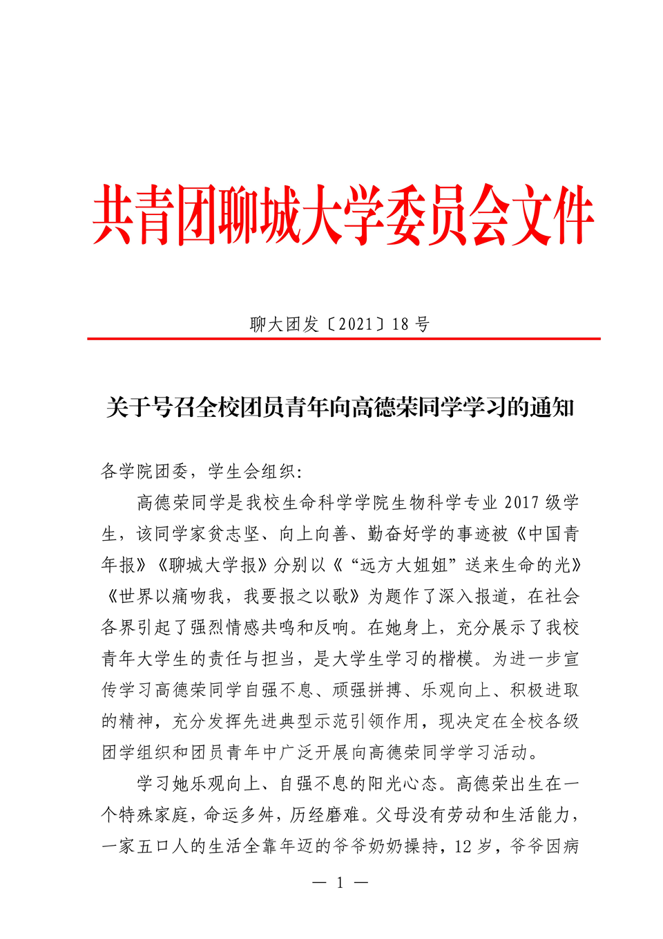 学校团委印发通知:号召全校团员青年向高德荣同学学习