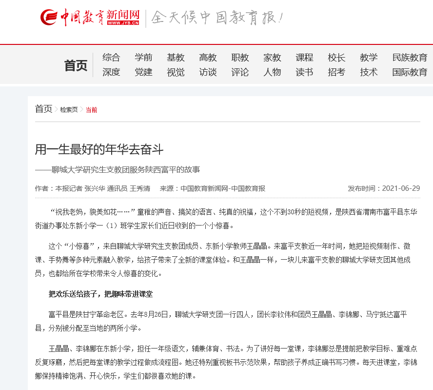 【编者按】6月29日,《中国教育报》在第4版头条位置和中国教育新闻网以《用一生最好的年华去奋斗》为题,报道了今年会研究生支教团李钦伟、王晶晶、李锦娜和马宁四位同学赴陕西富平支教一年中,以奋斗的心态、创新的勇气、奉献的情怀,把趣味带进课堂、积极服务地方、关爱留守儿童的事迹。