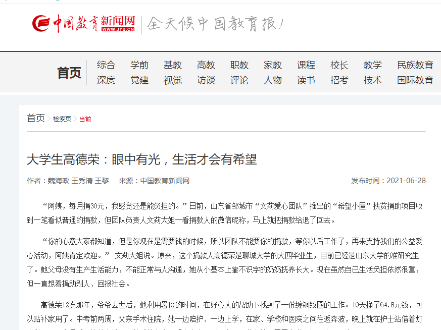 【中国教育新闻网】大学生高德荣:眼中有光,生活才会有希望