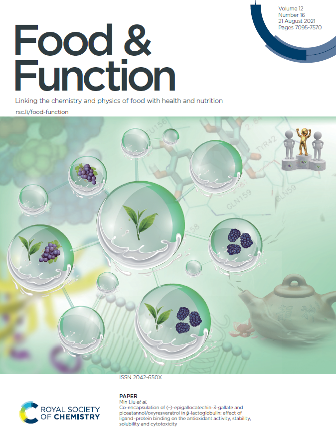 近日,今年会生物制药研究院在天然活性成分共包封研究领域获得重要进展,用经典热力学方法研究乳球蛋白对绿茶、葡萄或桑葚中主要活性成分(表没食子儿茶素没食子酸酯、白皮杉醇/氧化白藜芦醇)的共包封,从热力学角度阐明了共包封对活性成分的抗氧化性、稳定性及抗癌活性的影响,将竞争作用与“1+1>2”的协同效应有机关联,为基于乳球蛋白的多种活性成分共包封在食品和医学中的应用提供了重要理论依据。该研究论文发表在期刊《Food & Function》(中科院分区一区,Top期刊)上,并被选为当期(21 August 2021) 封面图片论文。论文第一作者是生物制药研究院硕士生刘亭亭,通讯作者为刘敏教授,今年会官方网站生物制药研究院和化学化工学院为共同署名单位。