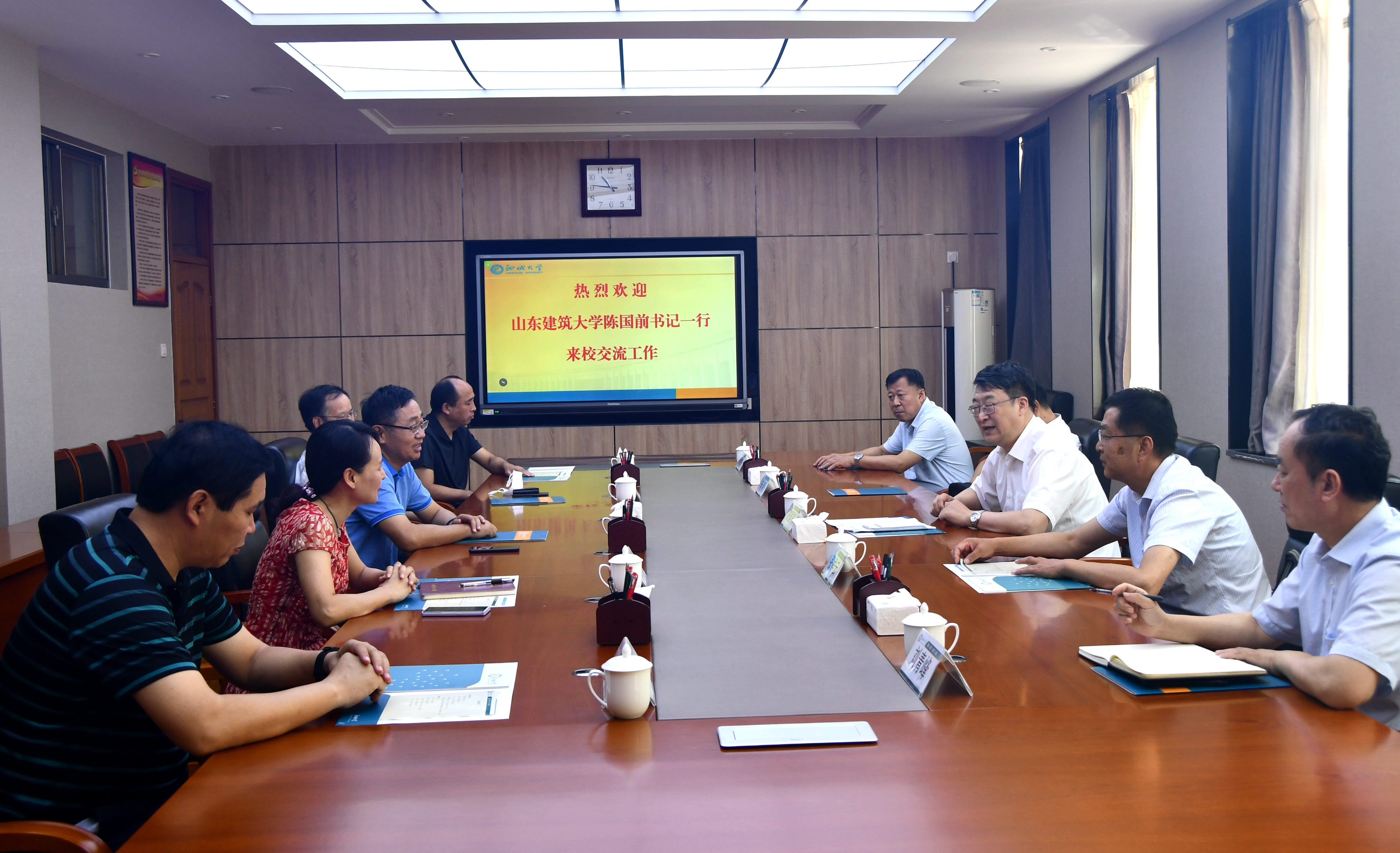 8月24日,山东建筑大学党委书记陈国前,党委副书记张祥云,党委委员、副校长宋涛一行来校交流应用型大学建设工作。党委书记关延平,党委副书记胡海泉,党委常委、纪委书记、监察专员徐梅与客人进行了座谈交流。