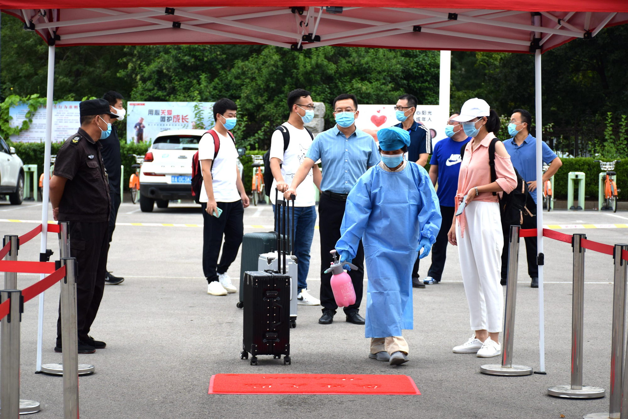 在东校南门,同学们间隔一米有序入校,工作人员对其行李逐一消杀,逐一进行体温测量、健康码和返校码查验,通过检测的同学顺利入校。演练发现一名同学体温异常,现场工作人员迅速带其至体温复检区进行体温复检,校医详细询问该学生的流行病史信息,复检后显示仍然异常,校医通过对讲机报告给指挥部,现场120急救车辆立即带离学生前往医院。同时随即对测温区进行封场、消杀等,保安封场并指导学生撤离至备用检测通道。