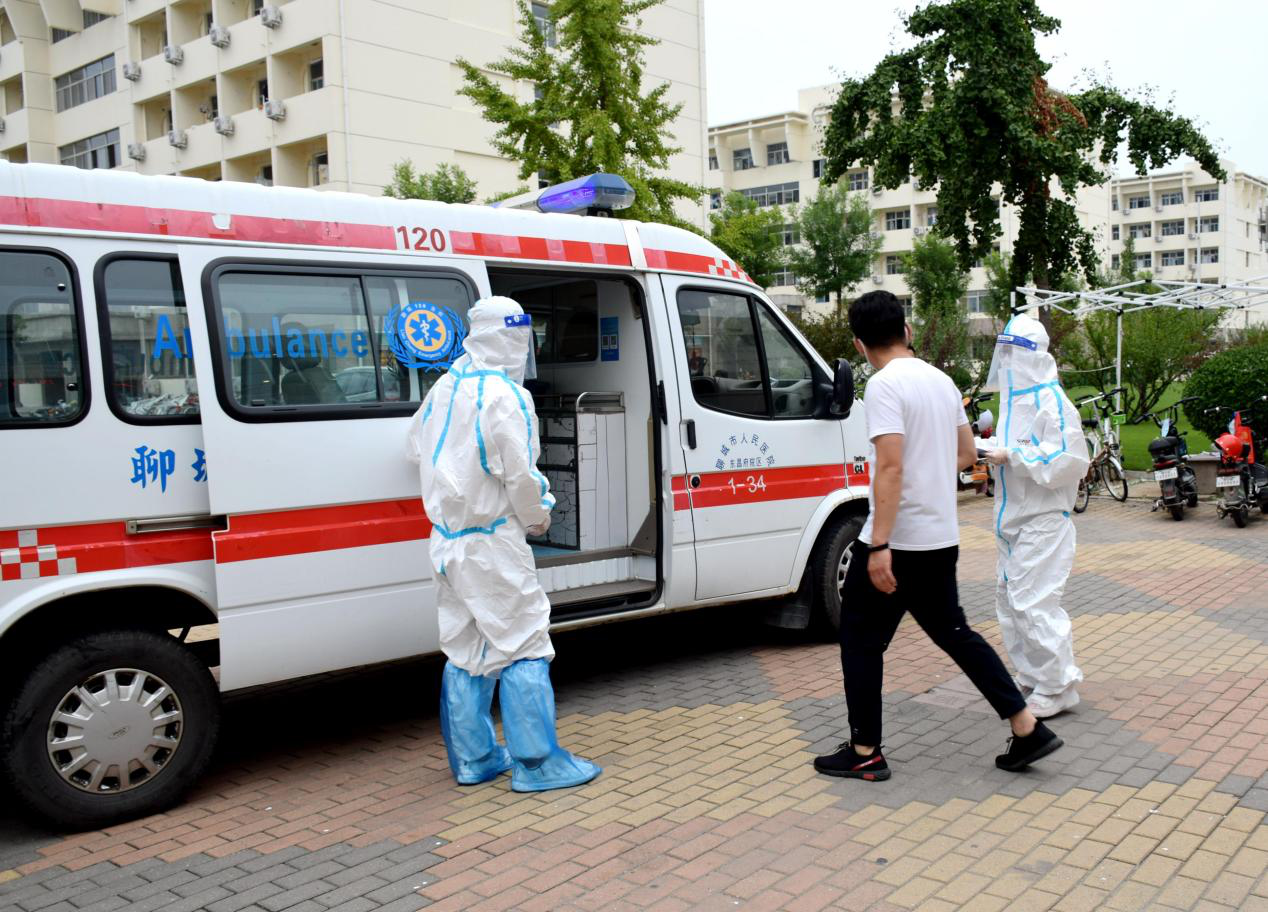 在群星公寓和雅苑餐厅,同学们排队接受体温检测,一名学生被发现温度异常,工作人员立即把他带入临时留观点,并拨打校医院电话,同时联系其辅导员上报学院。120急救车来到现场,接走学生送往医院就诊。后续相关处置工作也迅速跟进。