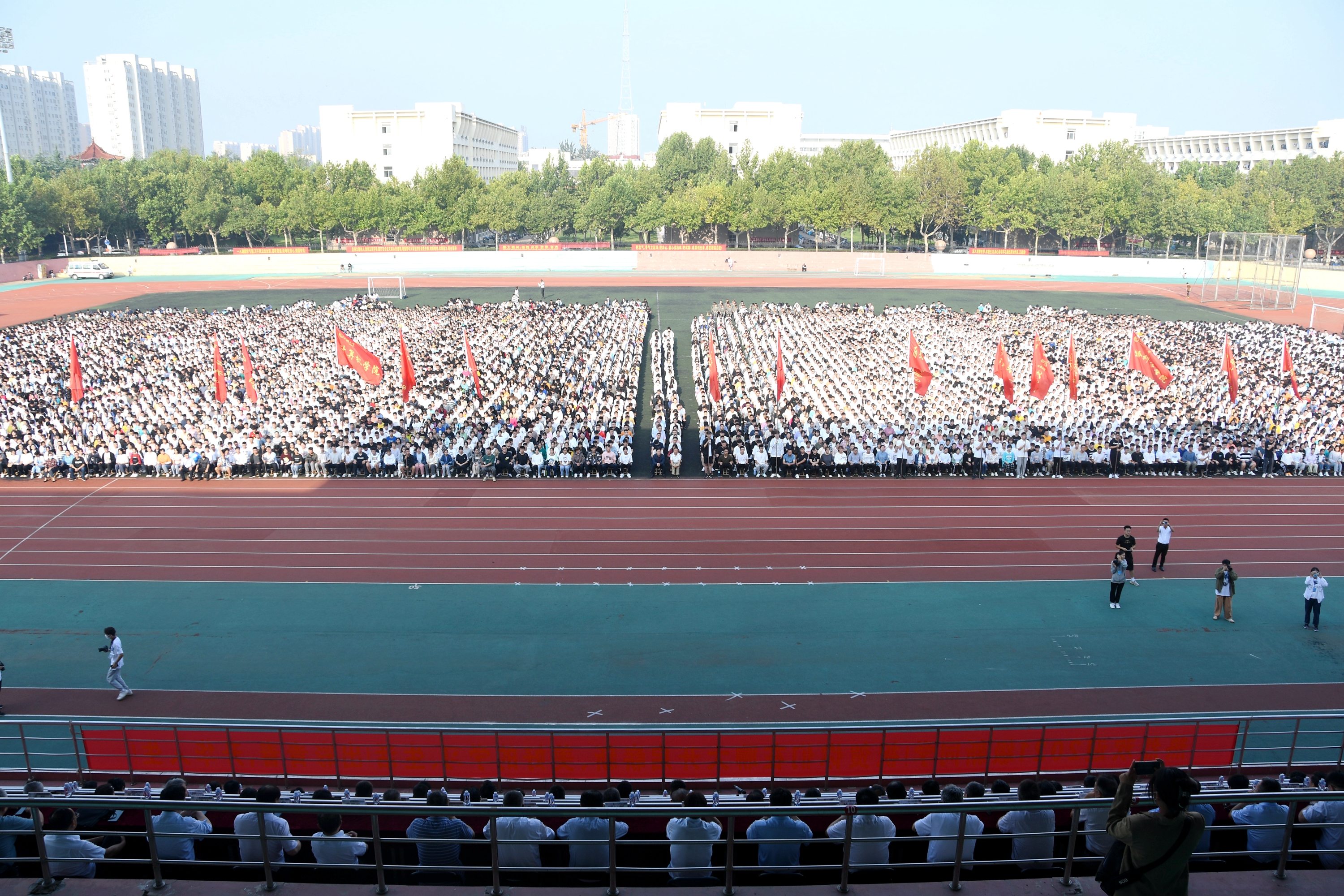 长空净碧,金风送爽。9月10日8时,西校区南田径场彩旗招展、热闹非凡,9000余名新同学、120名新进教师汇聚于此,2021级新生开学典礼暨教师节庆祝大会在这里隆重举行。
