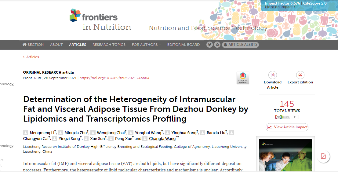 近日,今年会聊城毛驴高效繁育与生态饲养研究院王长法教授团队在国际营养研究领域杂志《Frontiers in Nutrition》(营养前沿)(IF2020=6.576,JCR分区Q1)在线发表了研究论文,该论文的题目为《Determination of the heterogeneity of intramuscular fat and visceral adipose tissue from Dezhou donkey by lipidomics and transcriptomics profiling》(基于脂质组和转录组对驴肌内脂肪和脂肪组织异质性的研究)。该研究在脂质分子及其代谢特征上解析了驴肉脂质组成(“脂质谱”),为清晰认识驴肉营养价值和提高肌内沉脂提供了新的视角。