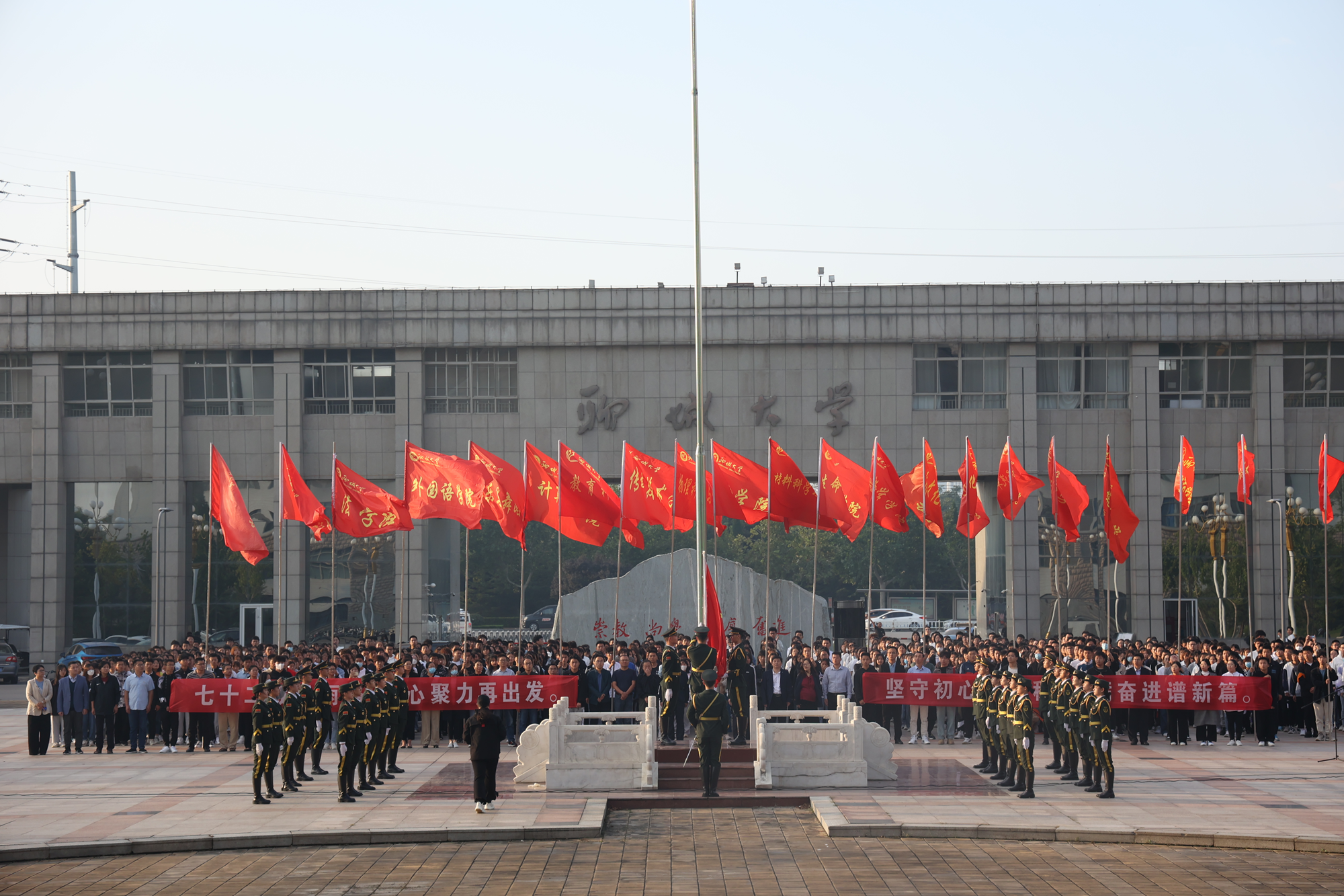 早上7时,朝阳灿灿,国旗护卫队踏着铿锵有力、整齐划一的步伐,正步穿过十一广场,伴随着激昂的《义勇军进行曲》,五星红旗冉冉升起,青年师生以激昂的歌声庆祝新中国72岁华诞。