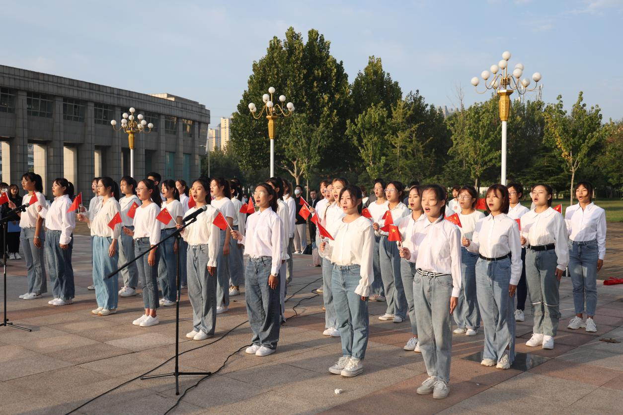 实现强国之我,歌唱青春力量。传媒技术学院合唱团领唱,在场全体师生迎着朝阳合唱《歌唱祖国》,高昂的庆祝歌声响彻十一广场。