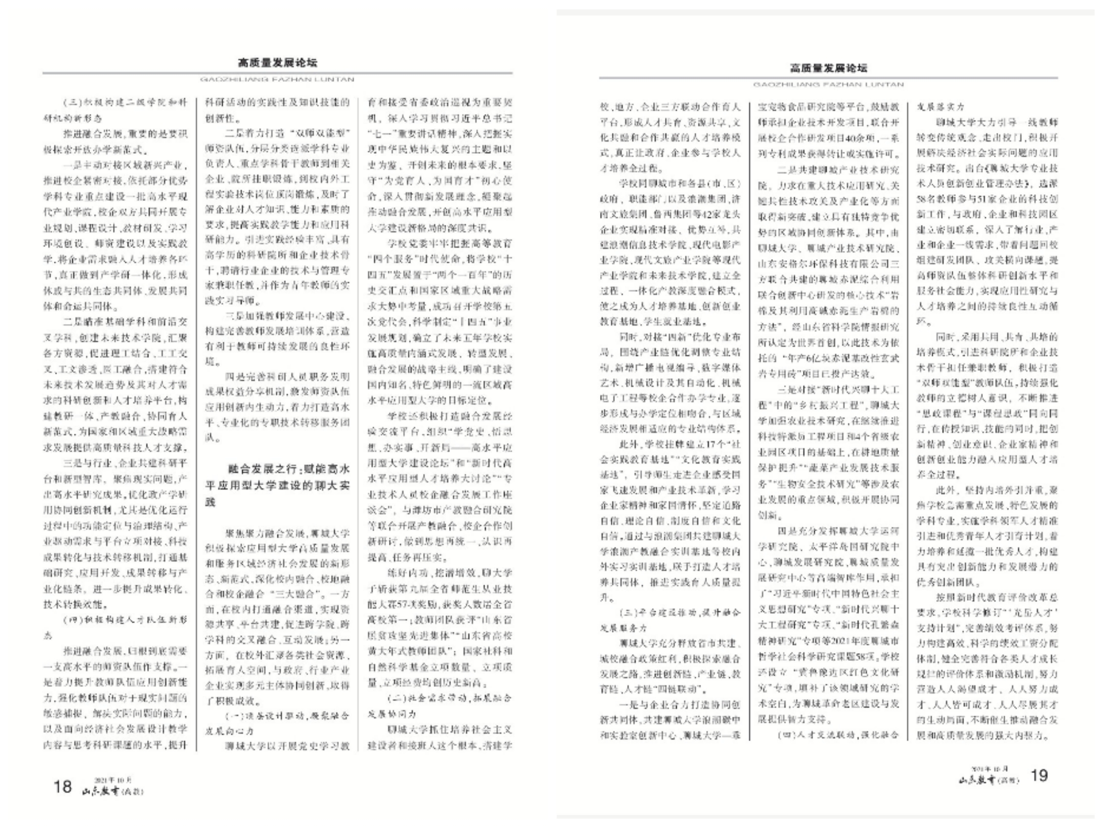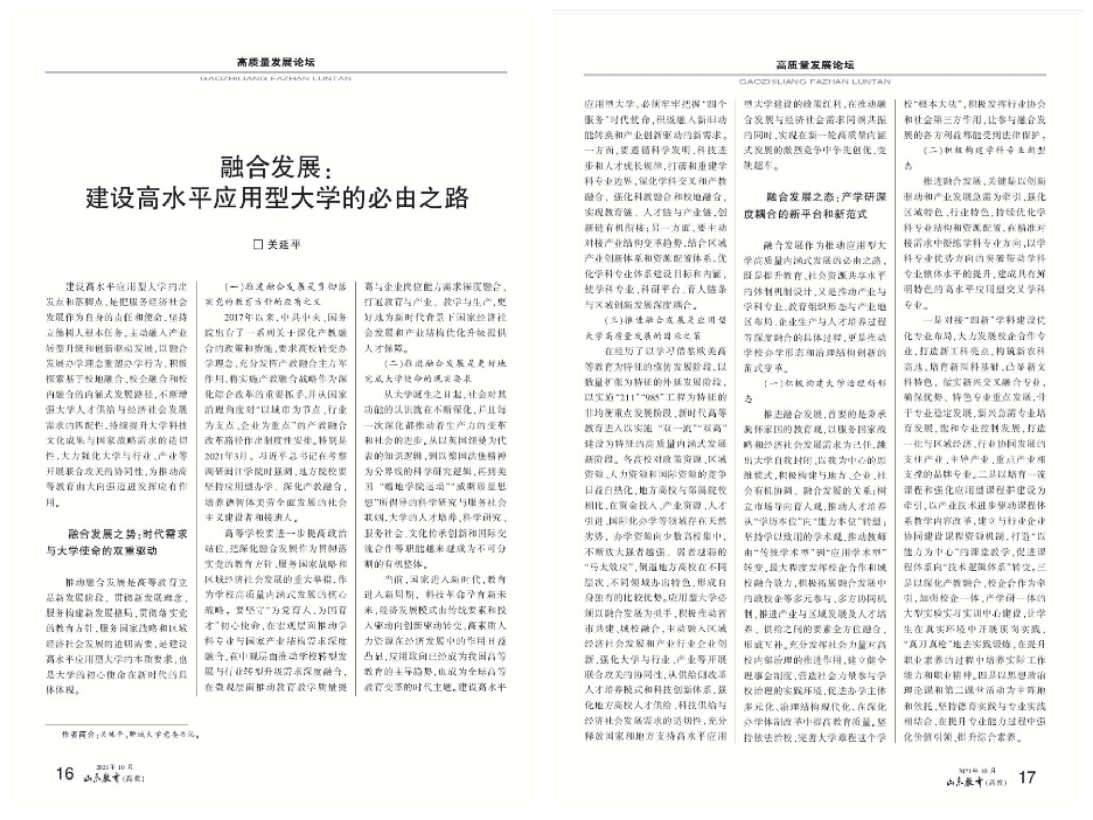 10月22日,党委书记关延平在《山东教育》高教版“高质量发展论坛”专栏发表题为《融合发展:建设高水平应用型大学的必由之路》的署名文章。