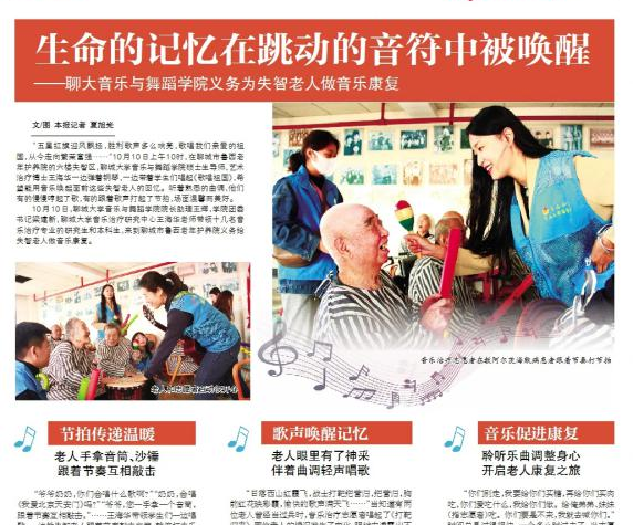 学院创立的“音为你”志愿服务师生团队,秉承“音为你、汇聚爱,照亮温暖前行之路”的服务理念,坚持奋斗在教学科研和服务社会的第一线,将科研成果进行有效转化,致力于特殊群体的身心康复服务,与聊城市特殊教育学校、聊城市残疾人康复中心、聊城市儿童福利院、聊城市第四人民医院、聊城市复退军人医院、山东省小海豚残疾人服务站等多家单位合作,建起多个“音乐治疗康复基地”,以专业手法为失智老人、残障人士、特殊儿童进行康复治疗,对大病患者施以临终关怀,为他们带去温暖和关爱,获得广泛赞誉,被国家级媒体关注报道,荣获全国中国青年志愿者优秀项目奖。