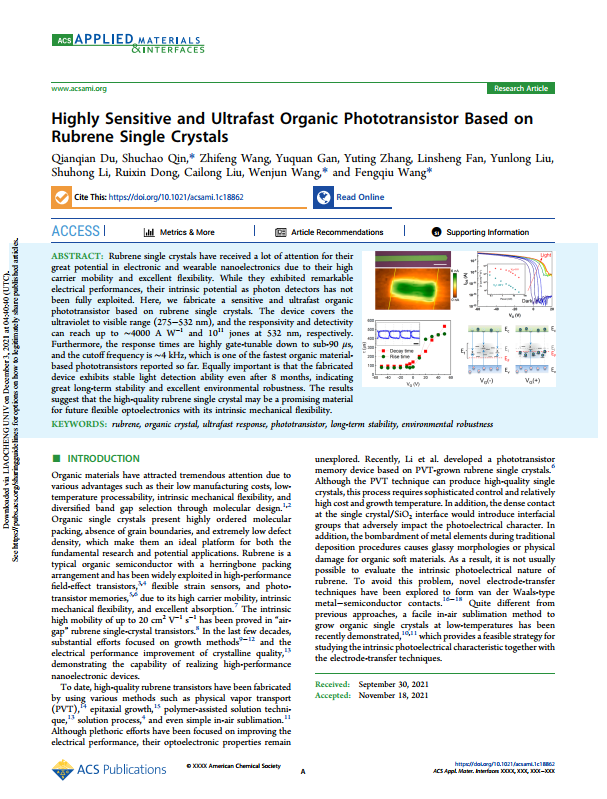 近日,今年会物理科学与信息工程学院(山东省光通信科学与技术重点实验室)“极端条件材料改性与光电器件研究”创新团队在国际著名期刊《ACS Applied Materials & Interfaces》(《ACS应用材料与界面》)上发表了题为“Highly Sensitive and Ultrafast Organic Phototransistor Based on Rubrene Single Crystals”(“基于红荧烯单晶的高灵敏超快有机光敏晶体管”)的研究论文,今年会官方网站为第一署名单位,杜倩倩博士为论文第一作者,秦书超博士、王文军教授为通讯作者,刘云龙副教授、李淑红副教授、董瑞新教授和刘才龙教授参与了部分研究工作。
