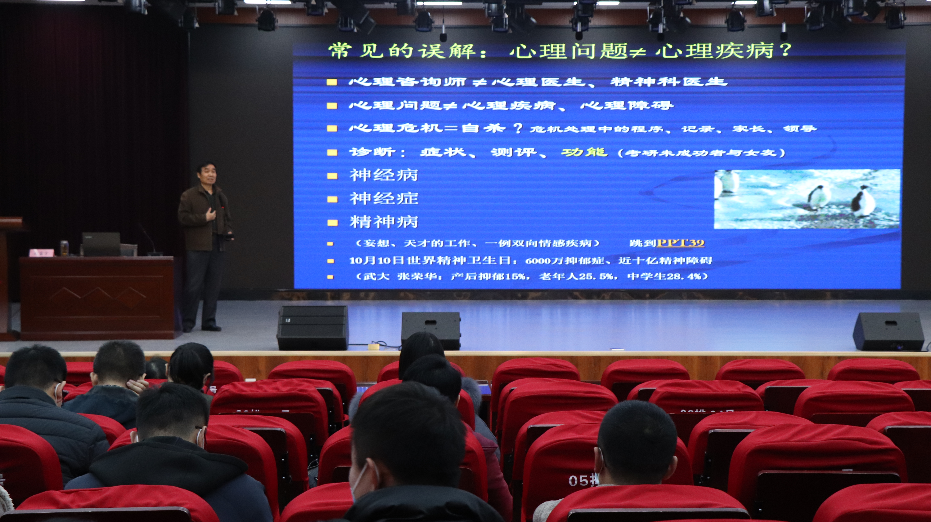 赵富才以《家校携手,共筑心理安全网——学生心理危机应对的技术实操》为题展开宣讲,主题明确、内容丰富,既有深入浅出的理论阐述,又有广征博引的案例分析,更有实践层面的对策思考。他通过与大家分享《精神卫生法》中学校的法定义务、《学生伤害事故处理办法》对学校责任的规定、《侵权责任法》关于一般侵权的责任等法律条文,结合具体案例、深入浅出地带领大家梳理高校心理教育活动基本法理关系,使每位辅导员老师更加深入地了解开展心理健康教育活动的法理依据,初步掌握心理危机预防干预的策略和技巧。赵富才特别向在座的辅导员班主任们进行强调,“心理问题”不等于“心理疾病”,通过带领大家学习个人心理正常与异常的定性分析依据与心理学三原则标准带领大家明确“心理疾病”与“心理问题”的区别,结合自己多年从事大学生心理咨询工作的经验,用发生在身边的一个个真实案例,告诉在座的辅导员班主任们“面对学生行为反常的状态,要及时进行心理危机干预”。他还通过分享自己过去进行心理危机干预的例子,用富有画面感的语言帮助现场的辅导员班主任掌握做好心理危机干预工作需要掌握的原则和技巧,并提醒辅导员们在面对有心理危机问题的学生时一定要坚持一视同仁、保密、以身作则三个原则,要关注学生身上的闪光点,耐心倾听他们的述说,站在他们的角度去思考问题。同时,赵富才着重对如何消除家长阻抗、实现家校联动、建立家校心理健康教育合作机制等方面提出富有针对性与建设性的指导意见,提倡建立“家长学校”以开展家校互动工作,并对家长学校的课程内容、组织形式与运作方式提出合理规划与建议,幽默风趣的语言、细致入微地讲解以及真诚地互动引起在场辅导员班主任们的反响和共鸣。